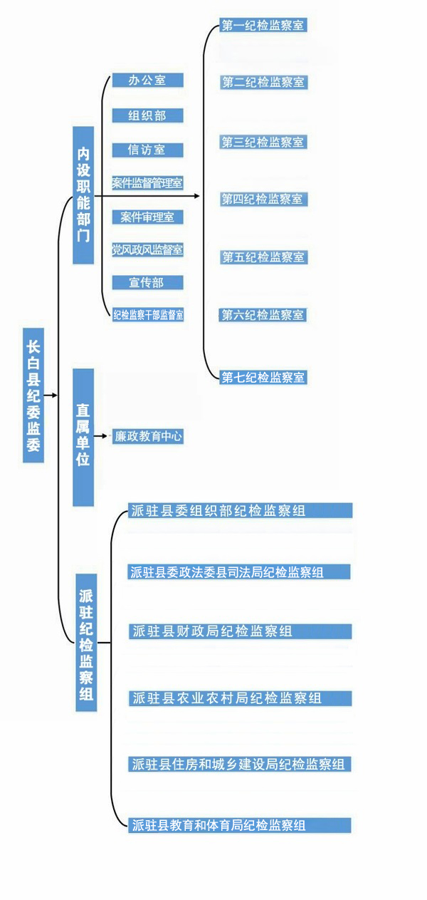 长白县纪委监委内设职能部门具体为:办公室、组织部、宣传部、信访室、案件监督管理室、党风政风监督室、第一纪检监察室至第七纪检监察室、案件审理室、纪检监察干部监督室。